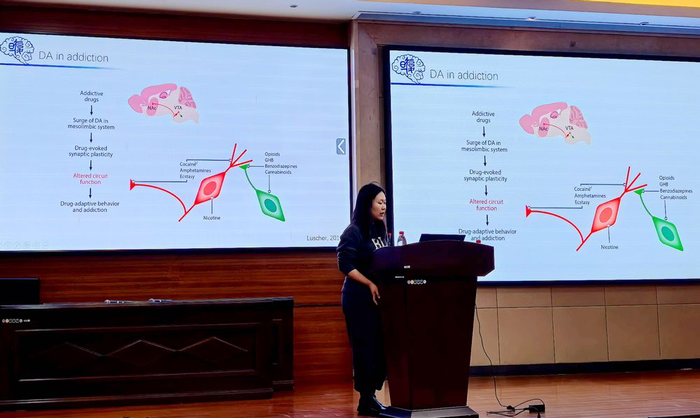 在第二部分研究中,李玥研究员介绍了在氯胺酮介导的突触可塑性在成瘾病理过程中的研究。她提出,氯胺酮通过解除腹侧被盖核多巴胺神经元的抑制来支持强化,并通过NMDA受体拮抗GABA能神经元等机制,解析了氯胺酮引起多巴胺驱动的正强化和低成瘾倾向的内在药理学机制。