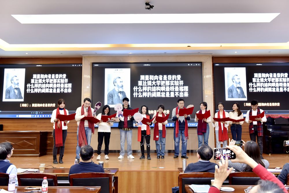 宋永宁老师的箫独奏《这世界那么多人》则是一段宁静而深邃的艺术享受。当悠扬的箫声响起时,整个报告厅瞬间安静下来,。在这一刻,音乐成为了连接所有人内心世界的桥梁,让老师们意识到即使身处喧嚣的世界,也能找到内心的平静。