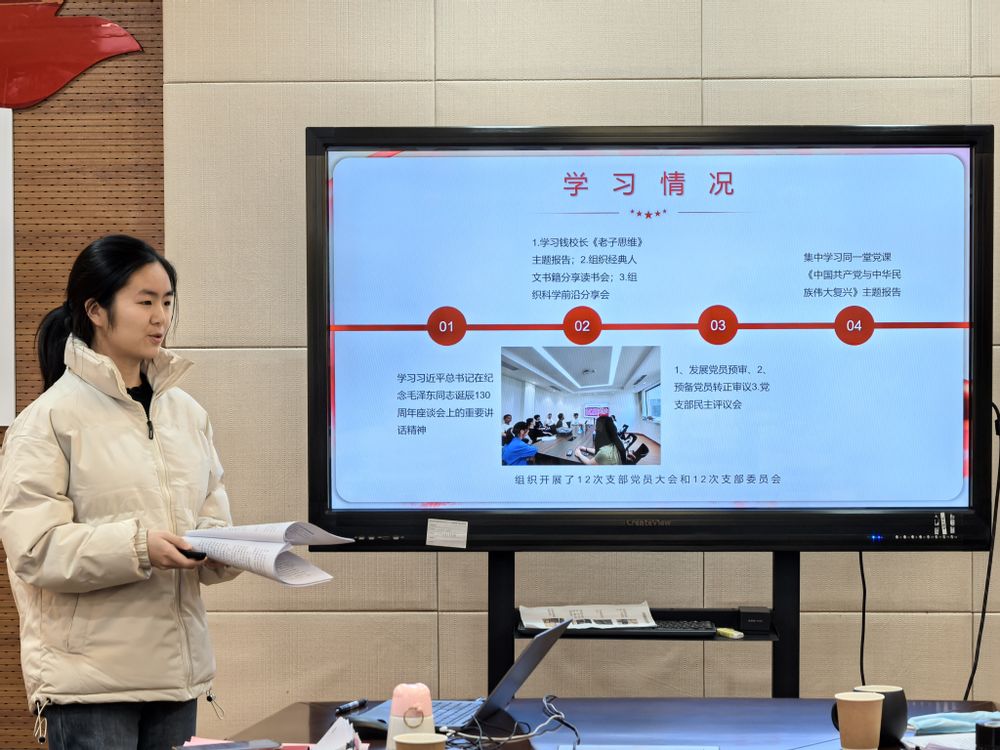 2023级专业学位硕士研究生党支部书记李京京围绕党员发展、组织生活、党纪学习教育、党员培训四个方面汇报总结了支部的工作情况。该支部扎实推进党员发展工作,顺利完成党员发展计划;在聆听党课的基础上,通过参观展览、参访红色基地等形式推进理论与实践学习的融合。针对学生党员理论学习不够深入、党员积极性与主动性不足、对党员关怀帮助不够等问题,她表示将更加关注党员实际需求,提高活动的吸引力和实效性。