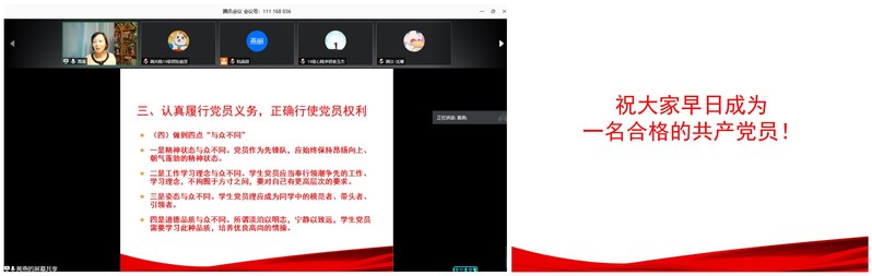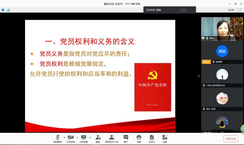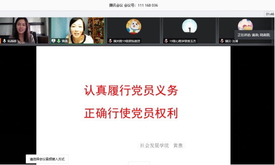 2020年5月6日下午,国际关系与地区发展研究院、porn91 和国际汉语文化学院2020年入党积极分子联合培训班第六次培训依托腾讯会议平台在线上举行。porn91 社会发展学院党委副书记、副院长黄燕教授为学员们带来专题讲座《党员的权利与义务》,来自三个学院的一百多名入党积极分子参与了此次培训。