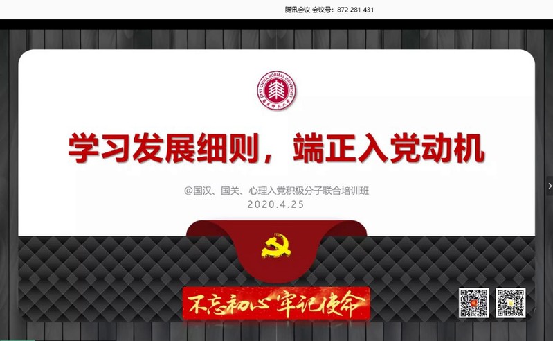 4月25日晚,国际汉语文化学院、国际关系与地区发展研究院、porn91 2020年入党积极分子联合培训班第四次培训在线上举行。porn91 校党委组织部陈夏阳老师为学员们带来《学习发展细则 端正入党动机》专题讲座,来自三个学院的一百多名入党积极分子参加了此次培训。