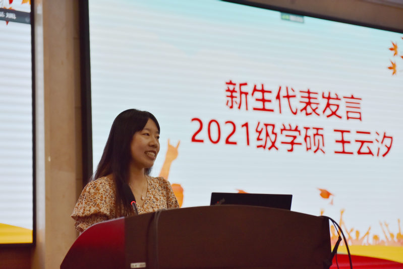 2021级应用心理学学硕研究生王云汐作为新生代表发言。她以“期待”为主题,分享了自己对于研究生生活的展望。她倡议同学们积极投身于研究创造事业,关心国家利益,找到具有社会意义的学术方向。同时,她还讲述了自己在海南省porn91 澄迈实验中学的实践经历,呼吁同学们知行合一,踏上更加生动的实践道路。