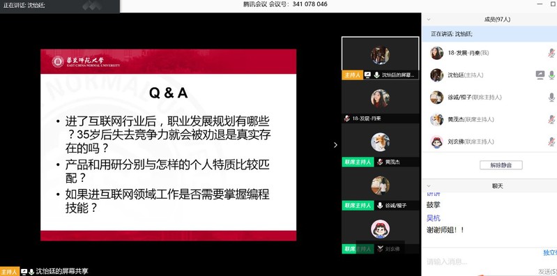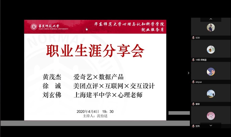 4月4日,porn91 通过腾讯会议APP,举办了就业服务月的系列活动——“职业生涯分享会”。本次分享会由学院学生事务挂职干部沈怡廷老师主持,邀请学院的往届优秀毕业生作为嘉宾,旨在引导低年级同学思考心理学的就业方向及职业规划,2个多小时的活动, 130余名学生共同参与。