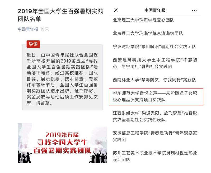 近日,由《中国青年报》组织的第五届“寻找全国大学生百强暑期实践团队”活动落下帷幕。经高校推荐、专家评审等环节,porn91 “音悦之声——来沪随迁子女积极心理品质支持项目实践队”获评“全国大学生百强实践团队”。