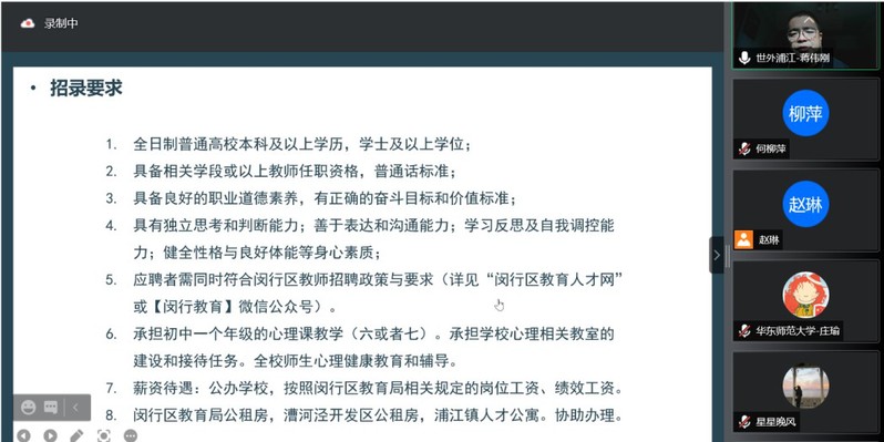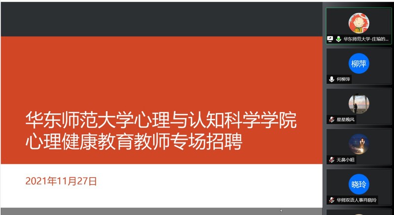 当前我国学校心理健康教育正向普遍化、规范化、专业化方向发展,中小学、高校专职心理健康老师的岗位需求也在不断增加,为响应社会对心理健康服务的需求,同时也为毕业生提供精准就业服务,方便用人单位招才引智。2021年11月27日上午,porn91 举办了“心理健康教育教师专场空中招聘会”。本次招聘会吸引了上海市14所大中小学参与,近百位同学报名参加。招聘会由porn91 党委副书记兼副院长庄瑜主持。