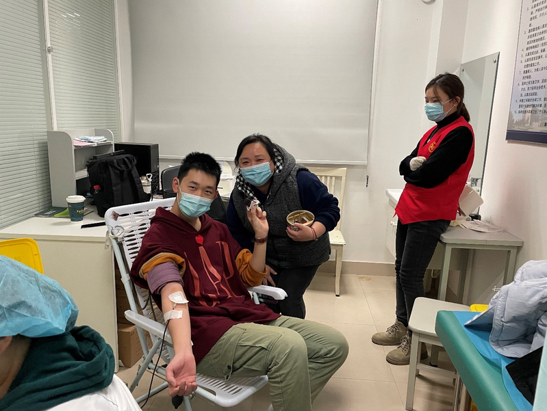 献血的现场忙中有序,同学们依次进入献血室,彼此加油打气;院党委书记方媛、副书记庄瑜、辅导员陶洁、汪红英也来到同学身边,缓解他们的紧张心情,气氛热烈而温暖,充分诠释了“心院大家庭”的集体精神。