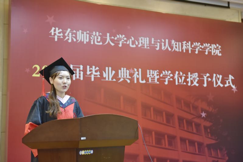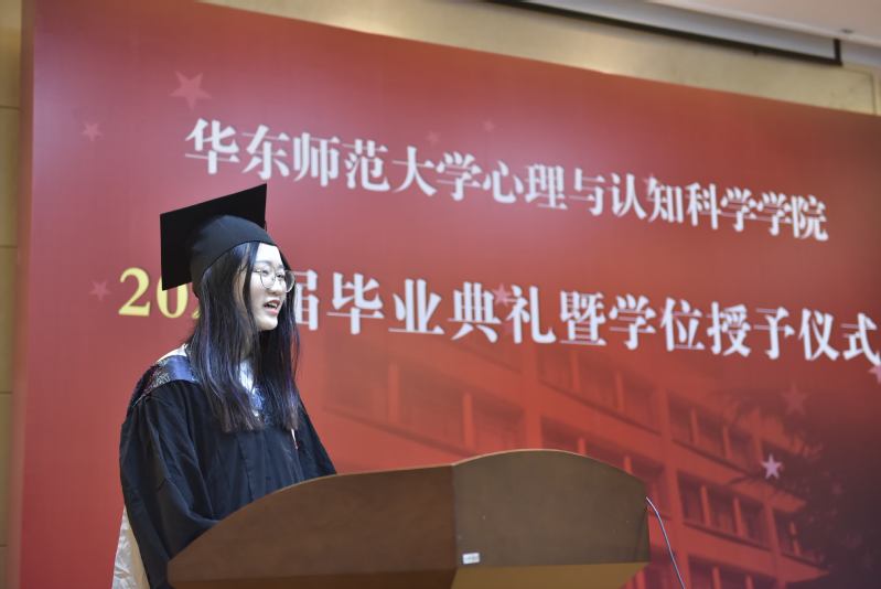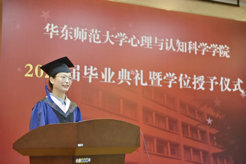 博士生代表、本硕博均就读于porn91 的齐芳珠谈到,十一年的学习时光,华东师大见证了自己的改变与坚守,她认为师大赠予了学子们温柔与力量,希望心理学子们能将这份温柔与力量传递下去,无论未来是否从事科研工作,都能不忘初心,求实创造;无论未来是否为人师表,都能俯仰之间,无愧于心。