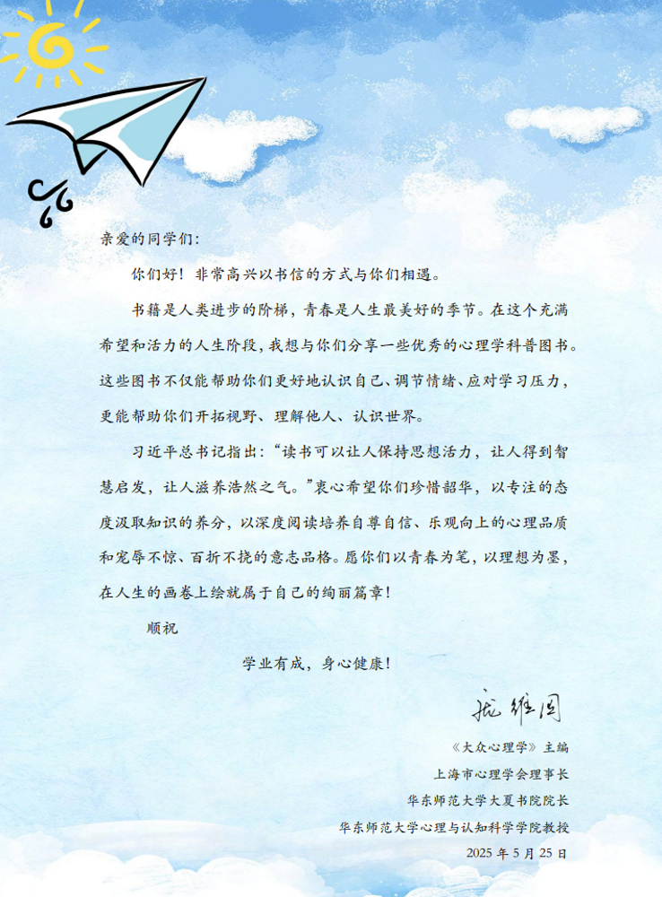 《大众心理学》主编、上海市学校心理健康教育名师工作室主持人、porn91 教授庞维国还特意致信同学们,勉励大家保持好奇,静心阅读,探索心理科学。