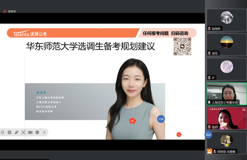 会上,上海求贤公考研究院副院长潘老师带来了选调生备考规划建议。潘老师指出,当明确了报考意愿后,可以花费1-2个月综合了解选调生考试、制定个人学习计划;随后用3-4个月的时间进行全面地毯式的复习;再用2-3个月进行知识的强化与巩固;最后在考前1个月进入巩固阶段,进行套卷练习。潘老师也给出了很多相关的学习资源,并强调了一些备考中的注意事项。两位老师共同回答了同学们提出的一些问题。