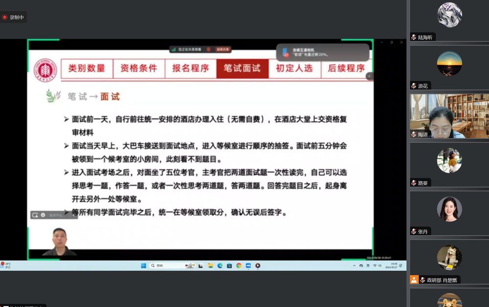 首先,心理学院2024届本科毕业生、2024年浙江省金华市婺城区选调生、现任浙江省金华市婺城区琅琊镇杨塘下村书记助理王珏同学通过线上录制视频的方式为大家介绍了浙江省选调生的类别数量、资格条件、报名程序、笔试面试、初定人选以及后续程序,并向大家分享了浙江省选调生的生活情况、自己入职后的感受等。