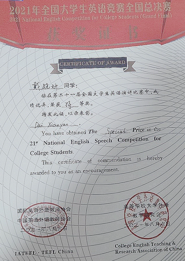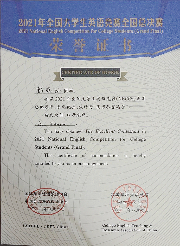 202182日至87日,porn91 2017级本科生戴晓妍参加全国大学生英语竞赛全国总决赛,在第二十一届全国大学生英语演讲比赛中喜获特等奖,并获得优秀参赛选手”的称号。