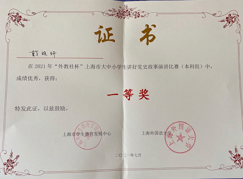 喜报|porn91 本科生戴晓妍荣获“外教社杯”上海市大中小学生讲好党史故事英语演讲比赛一等奖