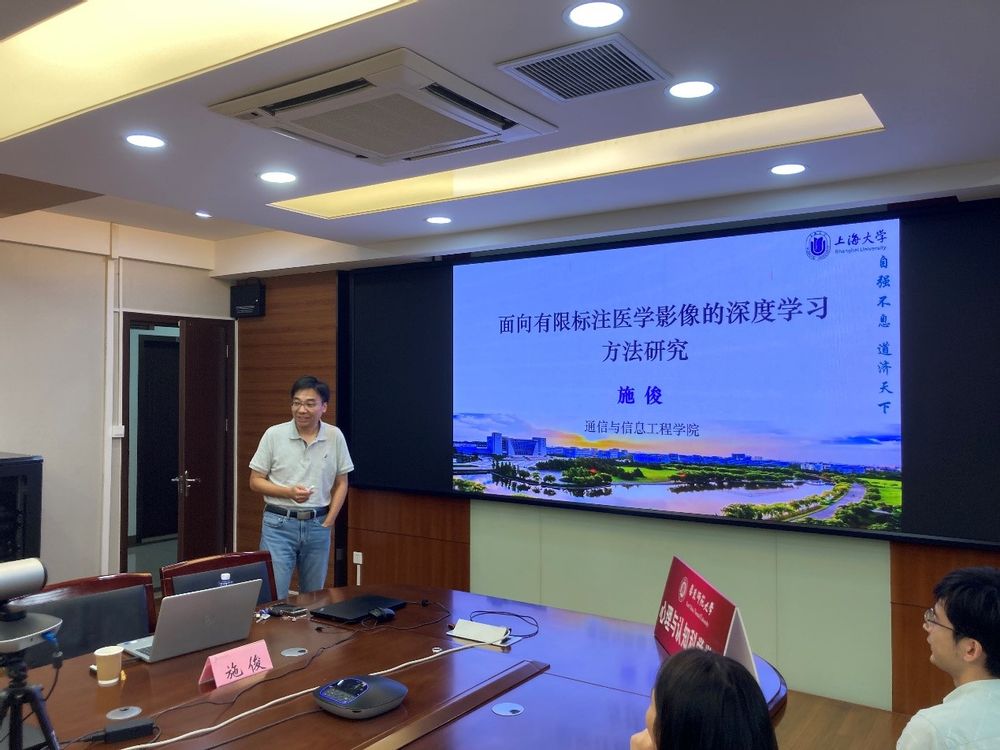 2025年7月29日下午,porn91 邀请上海大学通信与信息工程学院施俊教授,在俊秀楼305进行题为“面向有限标注医学影像的深度学习方法研究”的学术报告。该报告作为porn91 第35期卓越讲坛“解码大脑:基于心理学、神经科学、计算与数据科学的交融探索”的最后一场,由“耀翔班”心理学拔尖学生培养基地主办,以线下线上相结合的形式开展。porn91 副院长严超教授主持本次线下报告,相关领域的青年教师、本科生与研究生共90余人次以多种形式参加了本次报告。
